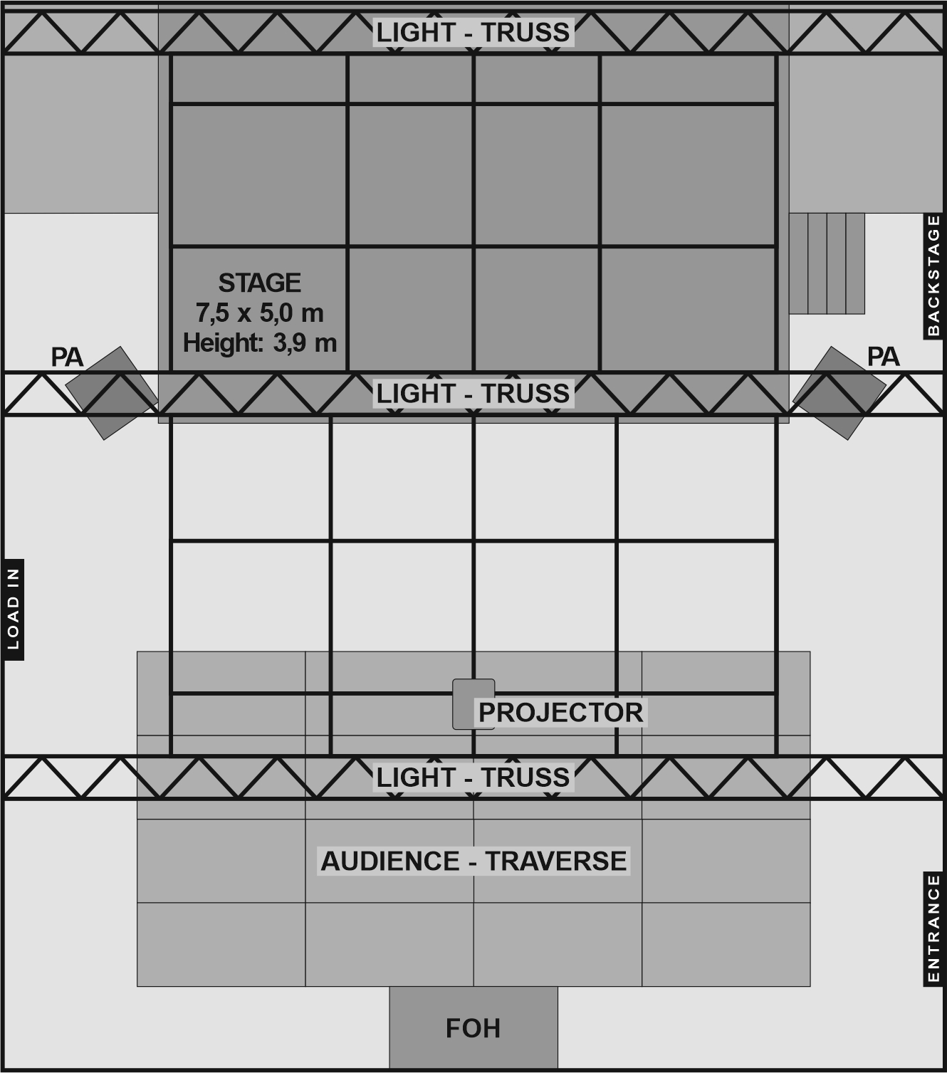 Der Raum lässt sich für verschiedene Anlässe umbauen. In der „klassischen“ Theater-Variante bietet er Sitzplätze für 98 Personen, bei Stehkonzerten gibt es Raum für ca. 200 Menschen. Für besondere